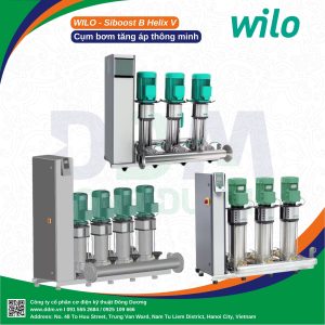 Bơm Booster Wilo SiBoost B Helix V – giải pháp tăng áp hiệu quả với công nghệ biến tần hiện đại, tiết kiệm năng lượng, vận hành ổn định. Hệ thống bơm làm từ thép không gỉ AISI 304, chịu áp suất lên đến 25 bar, bảo vệ chống khô và quá áp, đảm bảo an toàn cho hệ thống cấp nước. Công suất 380V, 50Hz, số lượng bơm từ 2 – 6, nhiệt độ chất lỏng -20°C đến 70°C, phù hợp cho tòa nhà cao tầng, khách sạn, bệnh viện.